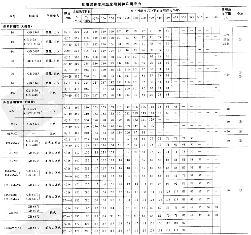 常用無縫鋼管使用溫度限制和許用應(yīng)力